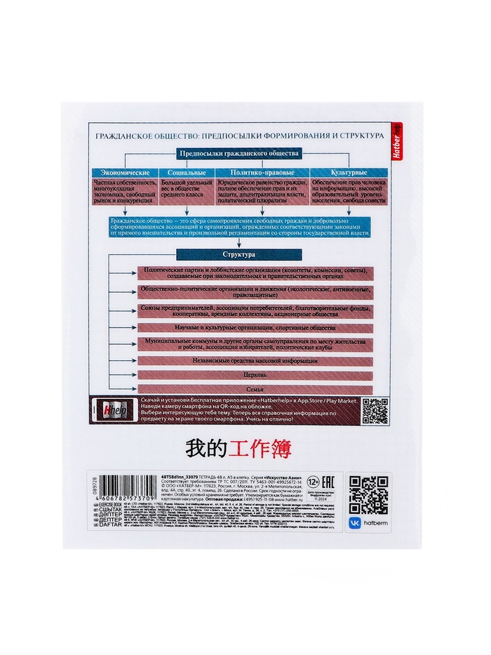 Тетрадь 48 листов в клетку «Искусство Азии» ОБЩЕСТВОЗНАНИЕ, пластиковая обложка с печатью, тиснение фольгой, с интерактивным справочником, б�... — Характеристики