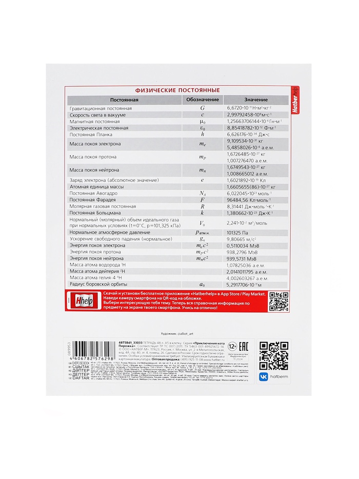 Тетрадь 48 листов в клетку «Приключения кота Пирожка» ФИЗИКА, обложка мелованная бумага, с интерактивным справочником, блок офсет — Характеристики