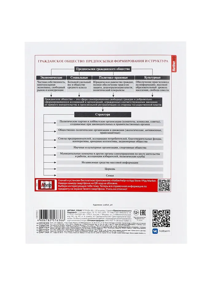 Тетрадь 48 листов в клетку «Приключения кота Пирожка» ОБЩЕСТВОЗНАНИЕ, обложка мелованная бумага, с интерактивным справочником, блок офсет — Характеристики