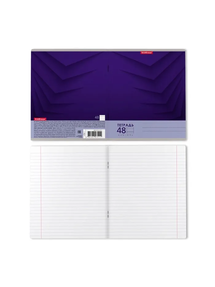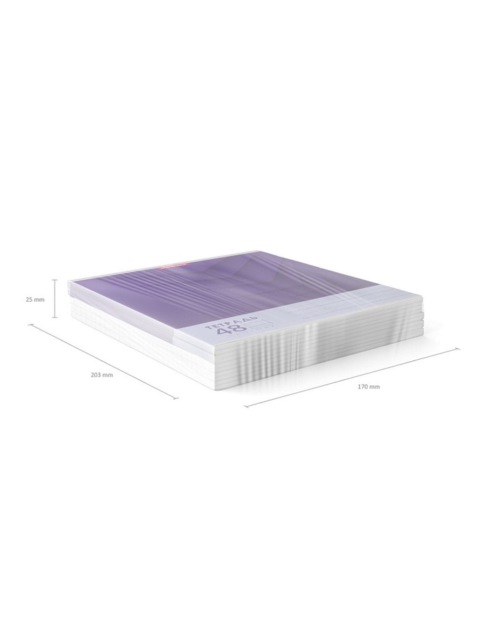 Тетрадь общая формата А5+ (170х203 мм). Обложка из высококачественного мелованного картона плотностью 190 г/м2. В блоке 48 листов в линейку с полями. Бумага офсетная плотностью 60 г/м2. Цвет линовки - синий. Скругленные уголки обложки и блока. Тип скрепления - скоба. Тетради одного цвета упакованы в термоусадочную пленку по 5 штук. Товар поставляется в нескольких вариантах цвета без возможности выбора.