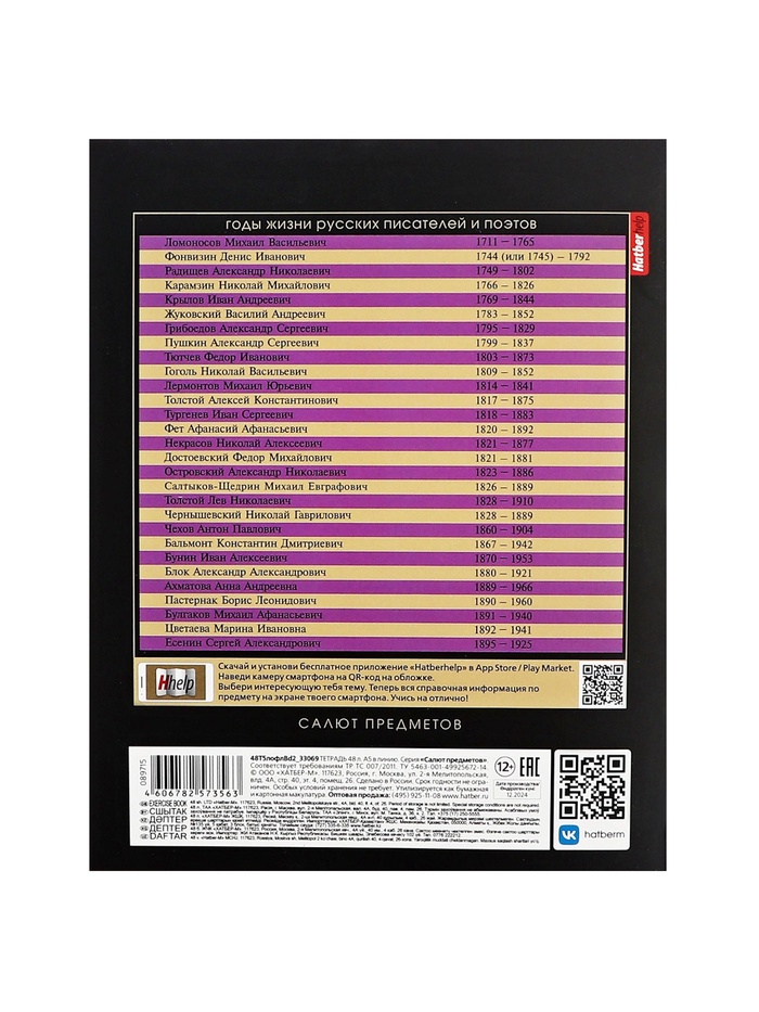 Тетрадь 48 листов в линию «Салют предметов» ЛИТЕРАТУРА, обложка мелованный картон, матовая ламинация, 3D-лак, тиснение фольгой, с интерактивным... — Характеристики