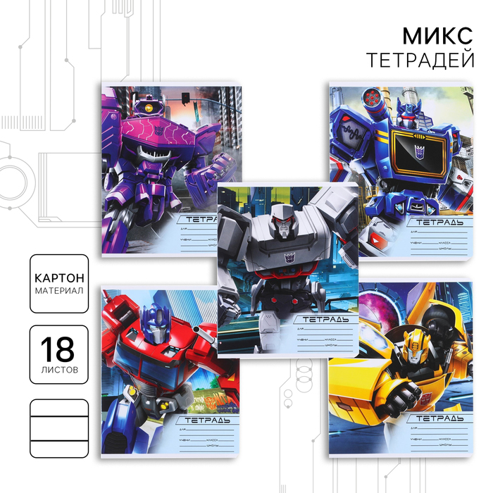 Тетрадь в линейку 18 листов, 5 видов МИКС, обложка мелованный картон, «Трансформеры»