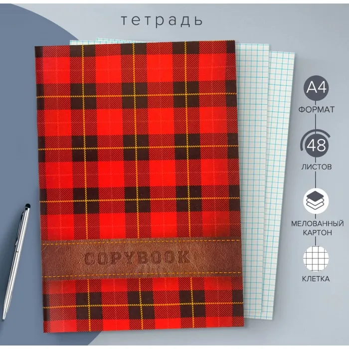 Тетрадь А4, 48 листов в клетку Calligrata «Красная Шотландка», обложка мелованный картон, блок №2, белизна 75%, (серые листы) — Характеристики