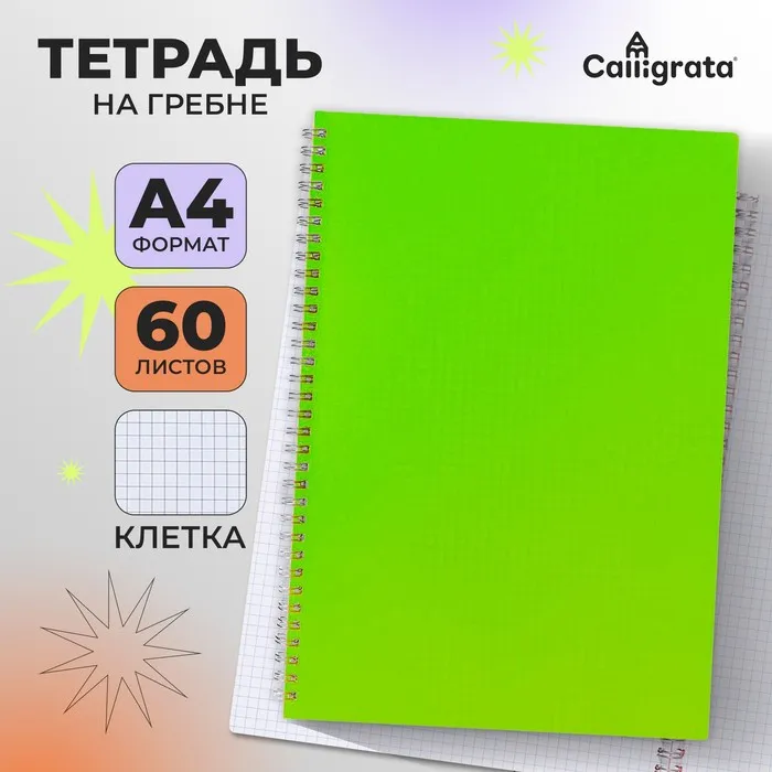 Тетрадь A4 на гребне, 60 листов в клетку, Calligrata, пластиковая обложка, зелёная — Характеристики