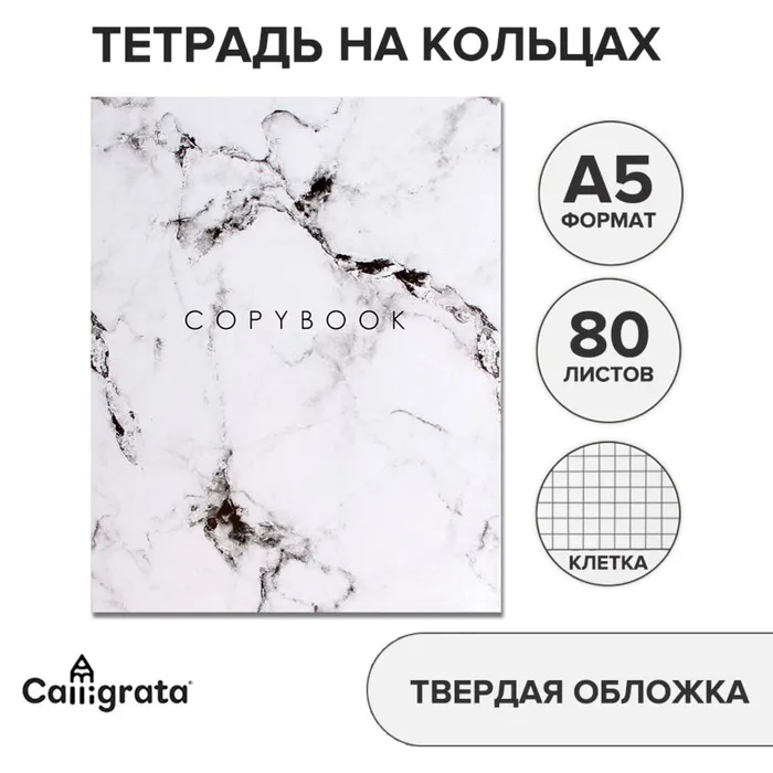 Тетрадь на кольцах A5 80 листов в клетку Calligrata «Мрамор Белый», обложка 7БЦ, без вырубки под кольца, блок офсет — Характеристики