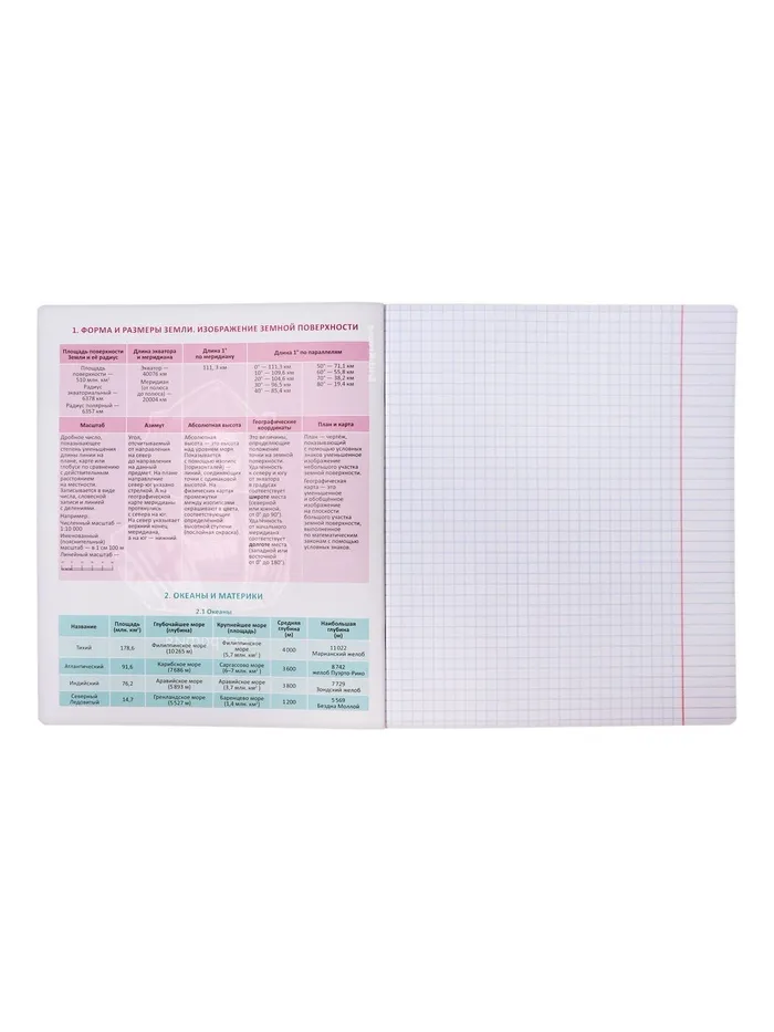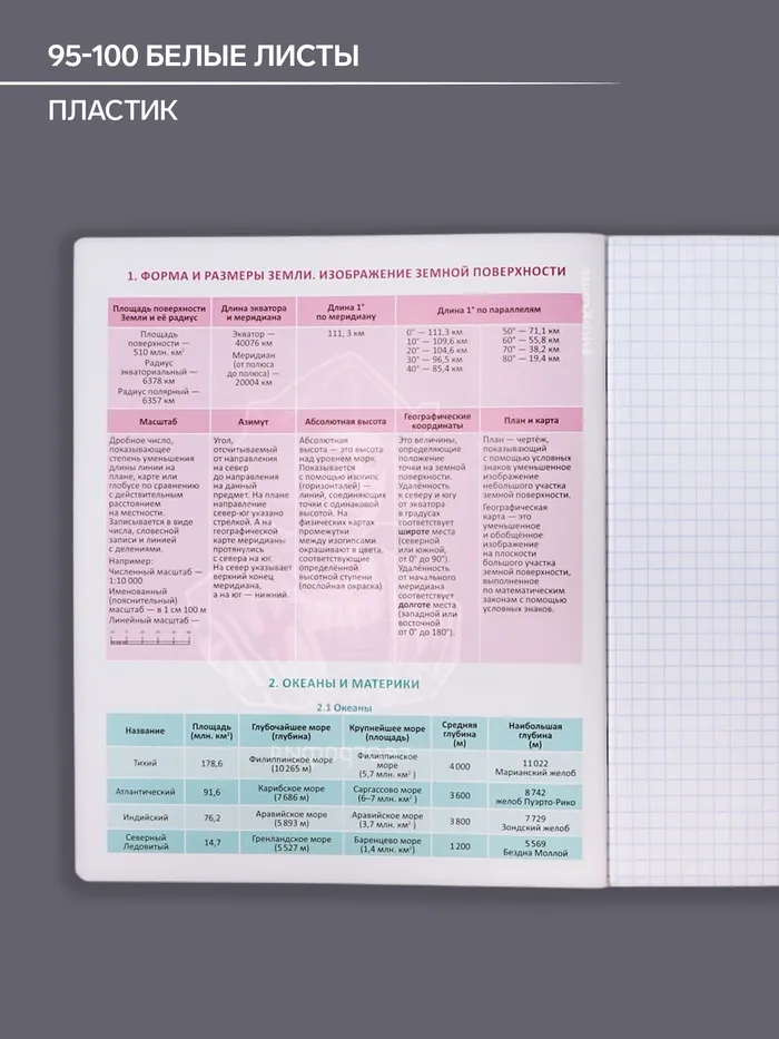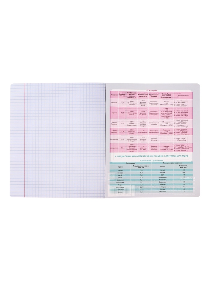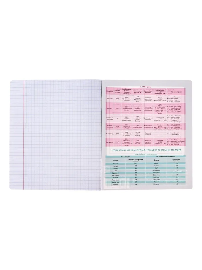 Тетрадь предметная формата А5+ (170x203 мм). Двойная обложка: внешняя выполнена из высококачественного износостойкого прозрачного пластика с фактурой «песок», внутренняя — из качественной мелованной бумаги. В блоке 48 листов в клетку с полями. Бумага офсетная плотностью 60 г/м2. Белизна бумаги - 100%. Цвет линовки - синий. Скругленные уголки обложки и блока. Тип скрепления - скоба. Имеет инфо-блок с кратким изложением школьной программы. Тетради упакованы в термоусадочную плёнку по 5 штук.