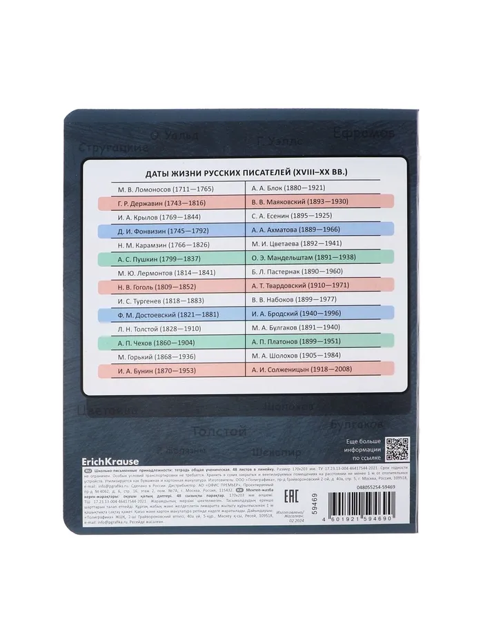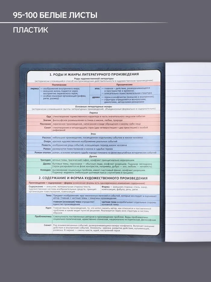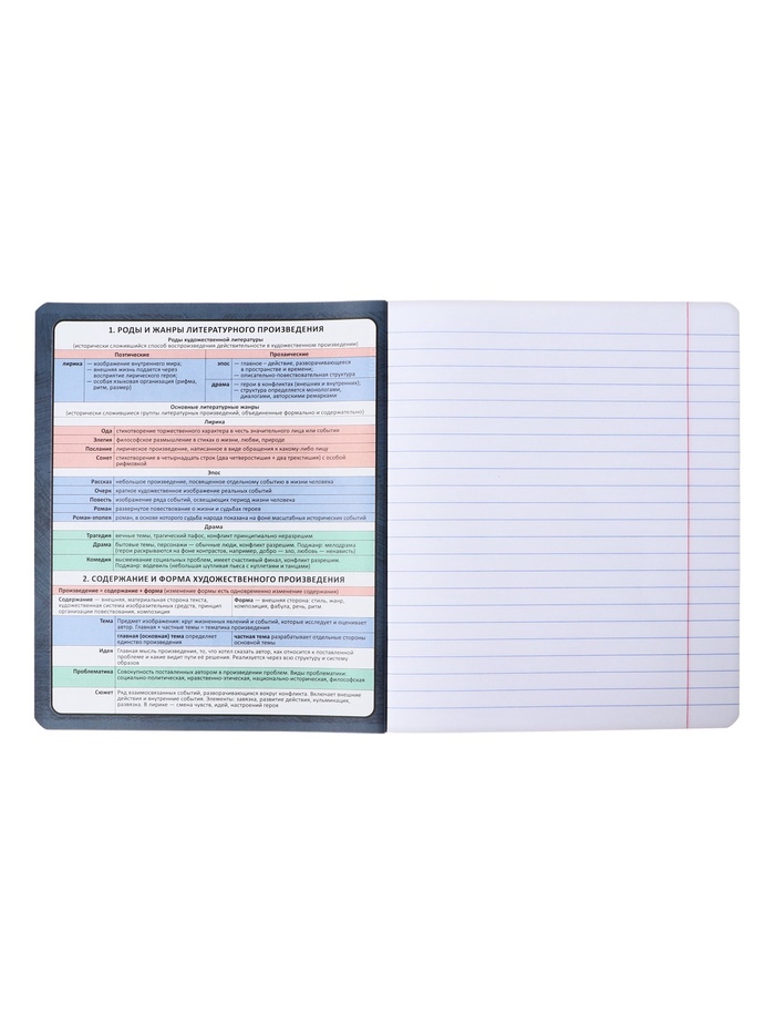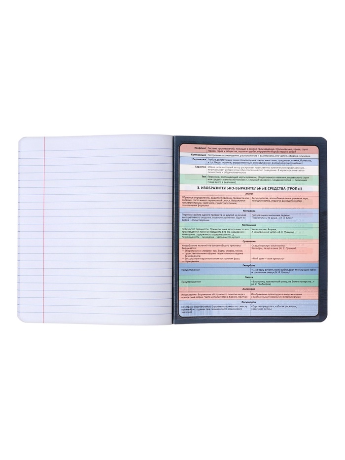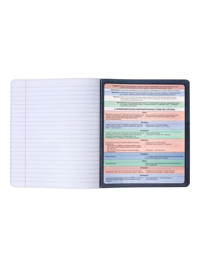 Тетрадь предметная формата А5+ (170x203 мм). Двойная обложка: внешняя выполнена из высококачественного износостойкого прозрачного пластика с фактурой «песок», внутренняя — из качественной мелованной бумаги. В блоке 48 листов в линейку с полями. Бумага офсетная плотностью 60 г/м2. Белизна бумаги - 100%. Цвет линовки - синий. Скругленные уголки обложки и блока. Тип скрепления - скоба. Имеет инфо-блок с кратким изложением школьной программы. Тетради упакованы в термоусадочную плёнку по 5 штук.