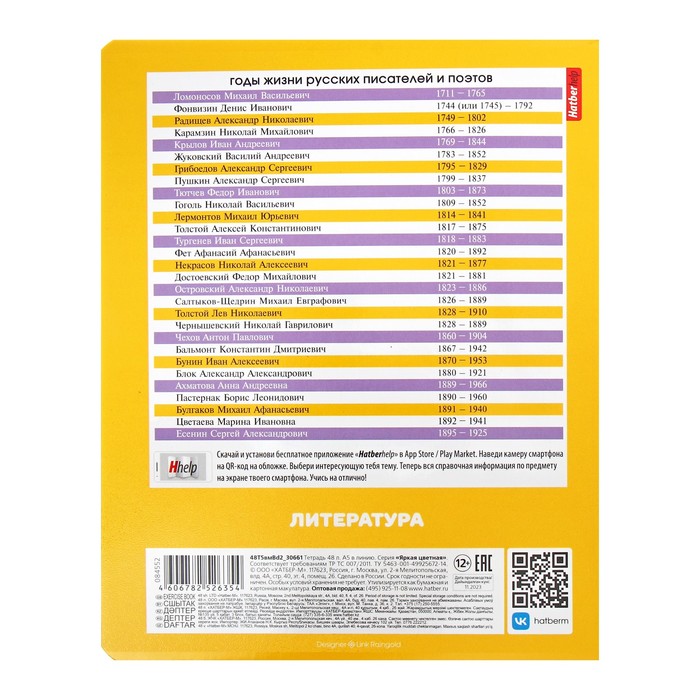 Тетрадь предметная "Яркая цветная", 48 листов в линию "Литература", обложка мелованный картон, выборочный лак, со справочным материалом — Характеристики