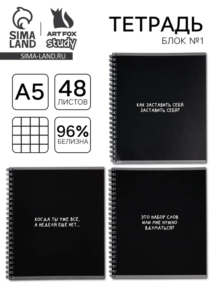 Тетрадь в клетку, 48 л., А5, на спирали, блок №1 «Черный фон. Фразы» МИКС — Характеристики