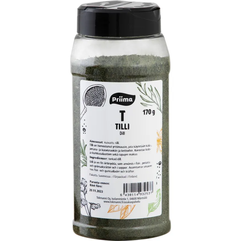 Priima – изысканная пряность, используемая для рыбных, картофельных и овощных блюд, а также для супов. Укроп подчеркивает вкус рыбных и огуречных салатов, а также раков. Удобная двухсекционная крышка для дозирования делает использование легким и удобным. Объем упаковки – 170 г.