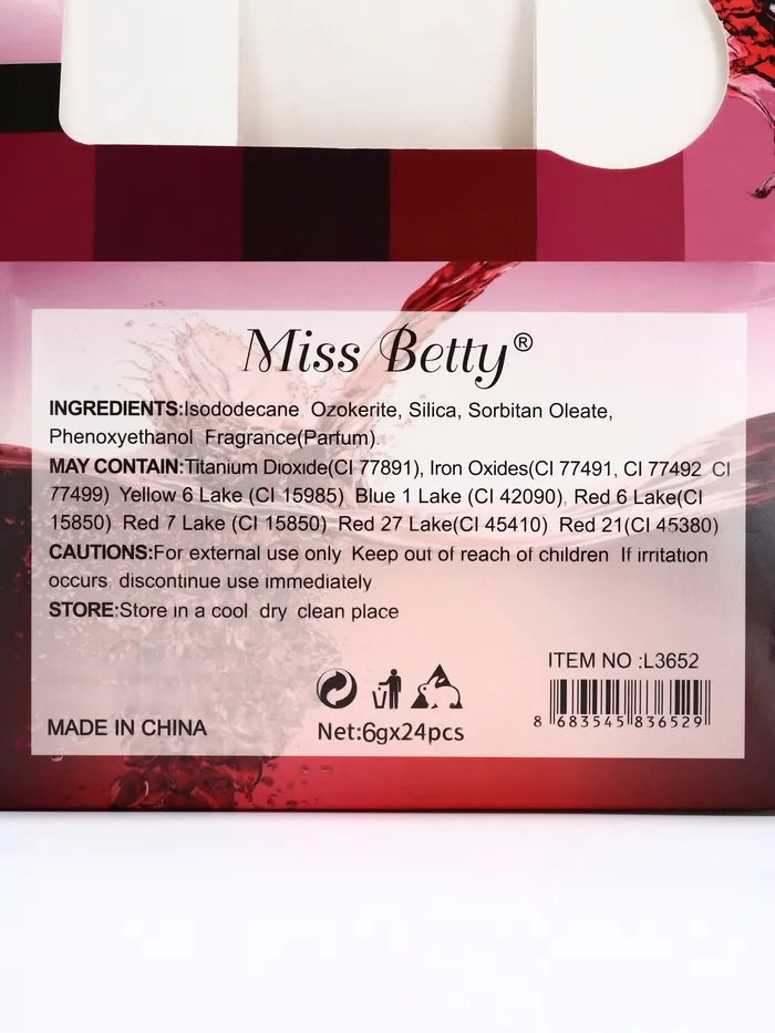 Состав: mineral oil, hydrogenated polyisobutene, 2-ethylhexyl palmitate, tridecyl trimellitate mica, lanolin oil silica, dla-tocopheryl acetate, propylparaben. Мay contain/pigment: iron oxide CI 77491, titanium dioxide/CI77891, Iron oxide yellowi/CI77492 d&c red no.6 balake/CI 15850:2,d&c red no.7 ca lake/CI15850:1,d&c red no.27 AI lake/CI 145410:2 iron oxide black/CI77499.