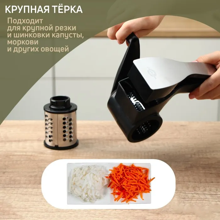 Тёрка многофункциональная работает по принципу мясорубки. Ручная терка имеет ударопрочный корпус, сделанный из безопасного пластика и нержавеющей стали. Это отличный выбор для девушки, женщины или сестры, которые проводят много времени на кухне.