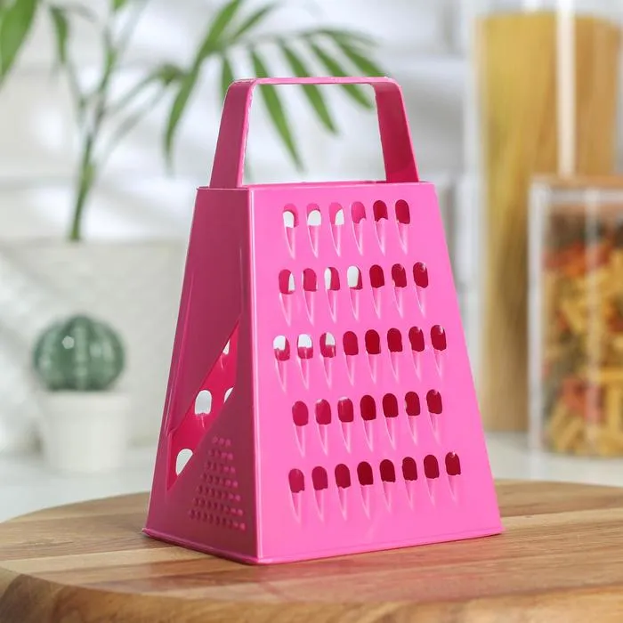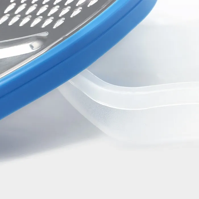 Для того чтобы вам было удобнее, а ваша кухня оставалась чистой в процессе приготовления пищи, терка идет с лотком для нарезанных продуктов. Терка устанавливается на лоток, не скользя и не падая, а ваши нарезанные продукты не разлетаются по всему столу, а собираются в лотке из поликарбоната.