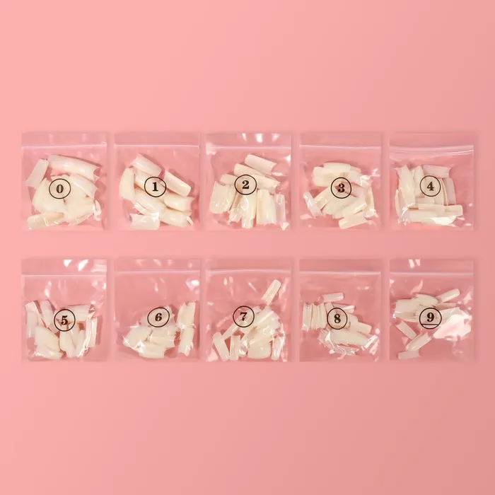 Каждый набор включает 500 типс, представленных в десяти различных размерах, что позволяет легко подобрать идеальный вариант для любого размера ногтя. Благодаря форме мягкий квадрат и короткой контактной зоне, эти типсы обеспечивают удобство и надежную фиксацию, а их нейтральный бежевый цвет гармонично сочетается с любым дизайном.