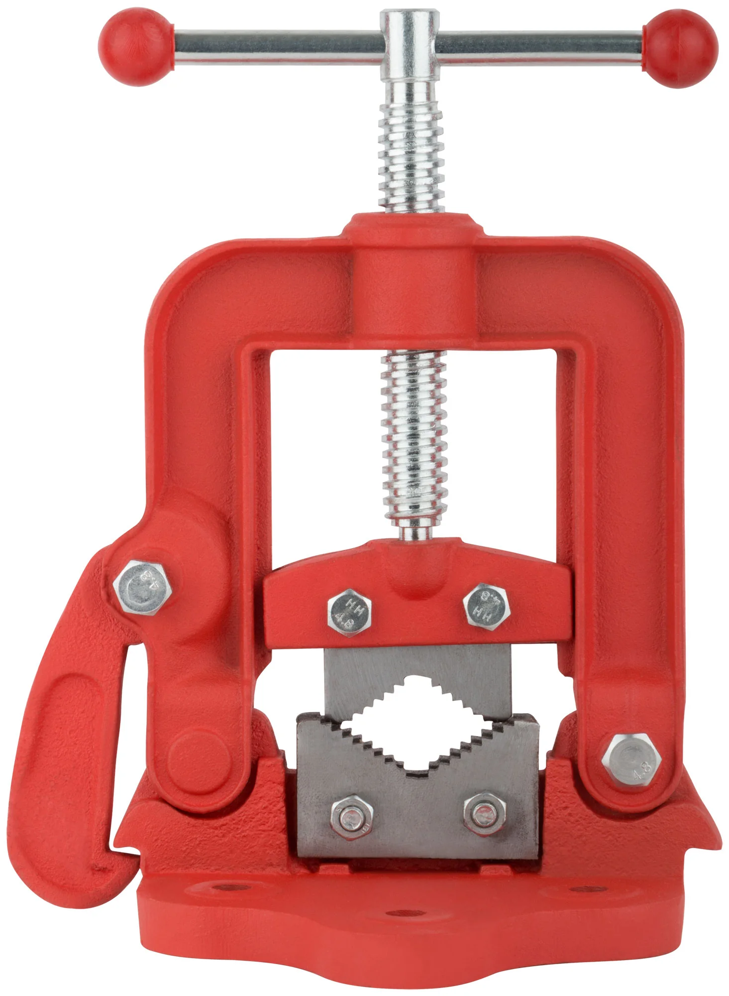 Конструкция тисков включает раму и станину из высокопрочного чугуна, что обеспечивает долговечность и устойчивость к нагрузкам. Губки и винтовая штанга изготовлены из инструментальной стали, что гарантирует надежное удержание труб в процессе работы.