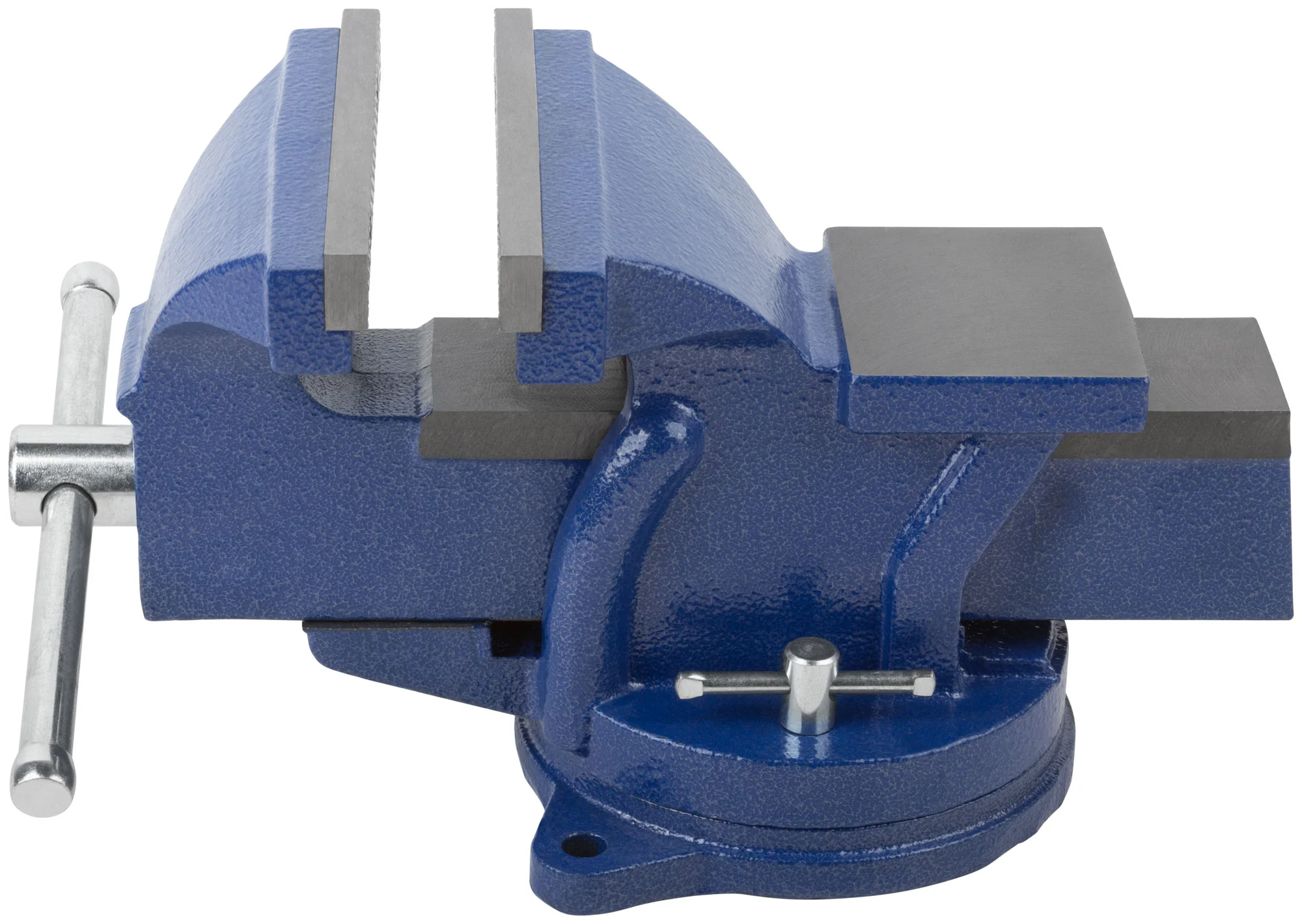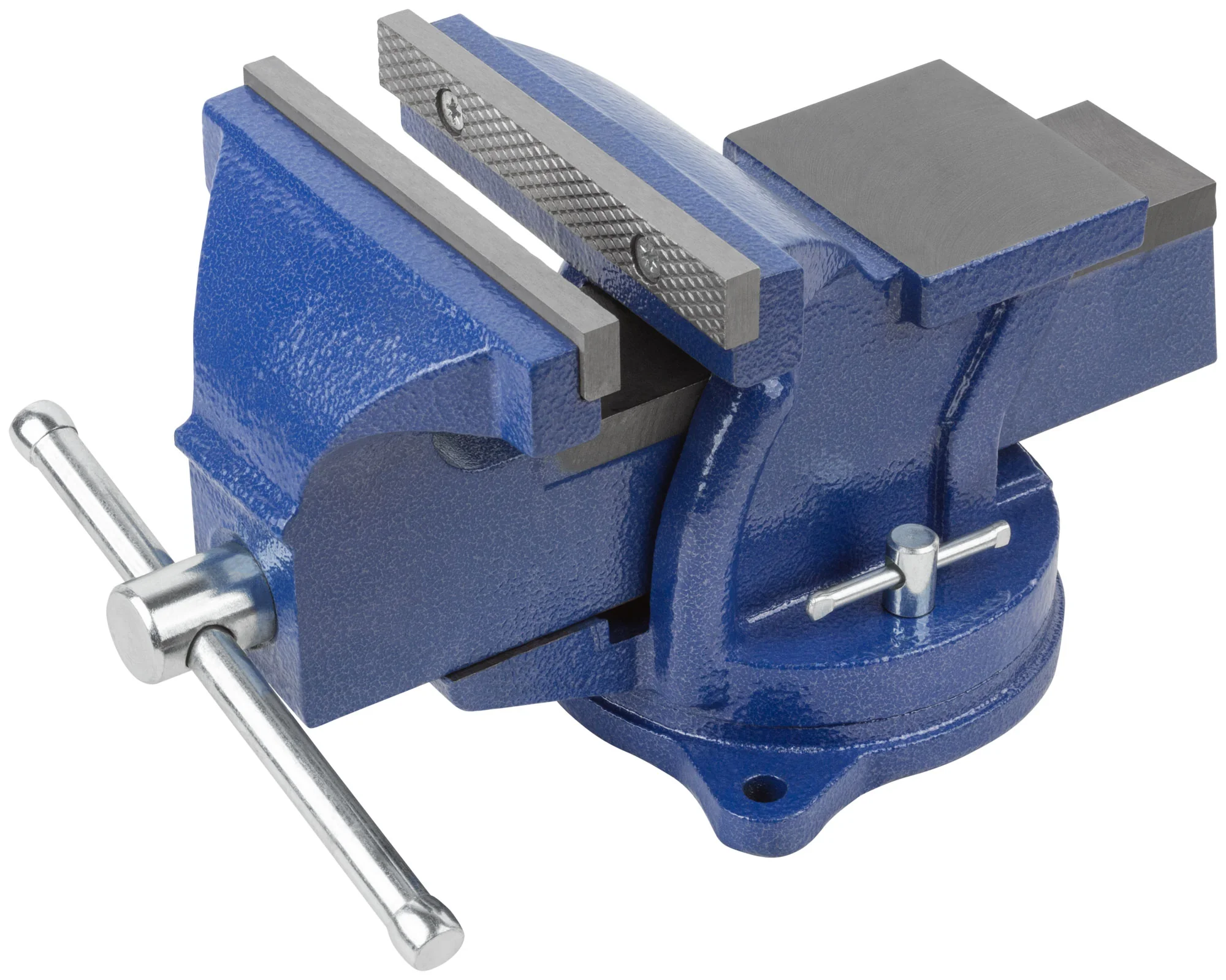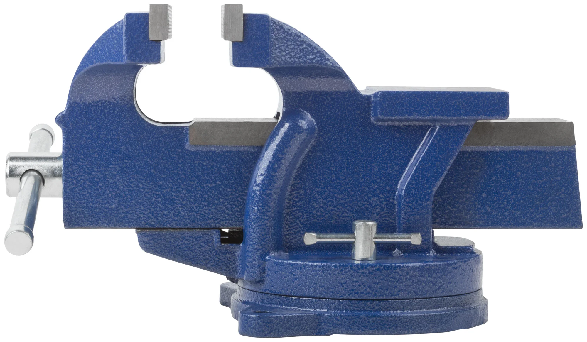 Тиски изготовлены из прочного чугуна, что обеспечивает долговечность и устойчивость к механическим повреждениям. Поворотная конструкция позволяет легко менять угол фиксации, а встроенная наковальня добавляет функциональности, упрощая работу с мелкими металлическими изделиями.