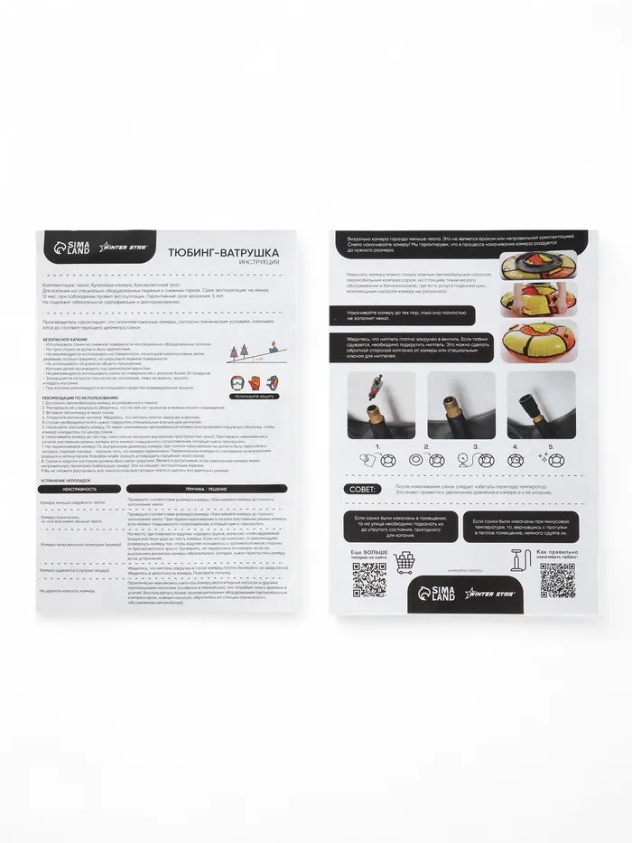 Требования по безопасности: запрещается кататься с трамплинов, по поверхностям с камнями или препятствиями, привязывать тюбинг к транспортным средствам, использовать его на других покрытиях, кроме снежных. Не предназначен для детей младше 3 лет.