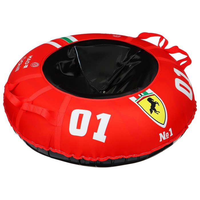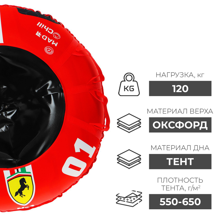 Дно тюбинга изготовлено из тентовой ткани плотностью 550–650 г/м², что гарантирует долгий срок службы и обеспечивает отличное скольжение. Снаряд оснащён безопасными ручками и молнией для быстрого доступа к камере. Имеет закрытую сердцевину, что исключает попадание снега внутрь. Для тюбинга подойдёт камера 15 дюймов. Предназначен для детей от 12 лет.