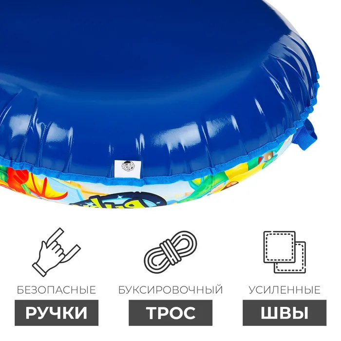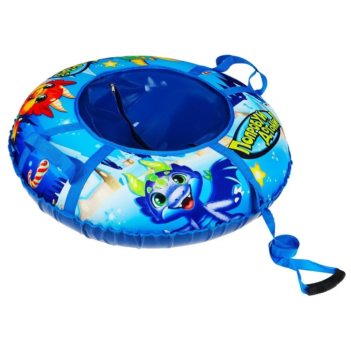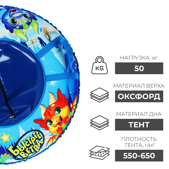 Дно тюбинга изготовлено из тентовой ткани плотностью 550–650 г/м², что гарантирует долгий срок службы и обеспечивает отличное скольжение. Снаряд оснащён безопасными ручками и молнией для быстрого доступа к камере. Имеет закрытую сердцевину, что исключает попадание снега внутрь. Для тюбинга подойдёт камера 13 дюймов. Предназначен для детей от 5 лет.