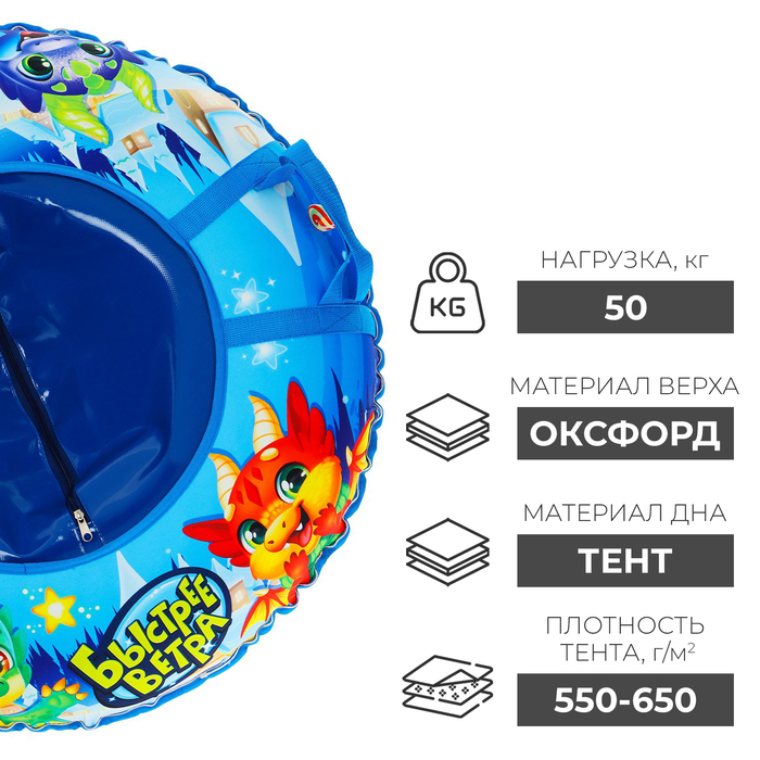 Дно тюбинга изготовлено из тентовой ткани плотностью 550–650 г/м², что гарантирует долгий срок службы и обеспечивает отличное скольжение. Снаряд оснащён безопасными ручками и молнией для быстрого доступа к камере. Имеет закрытую сердцевину, что исключает попадание снега внутрь. Для тюбинга подойдёт камера 13 дюймов. Предназначен для детей от 5 лет.