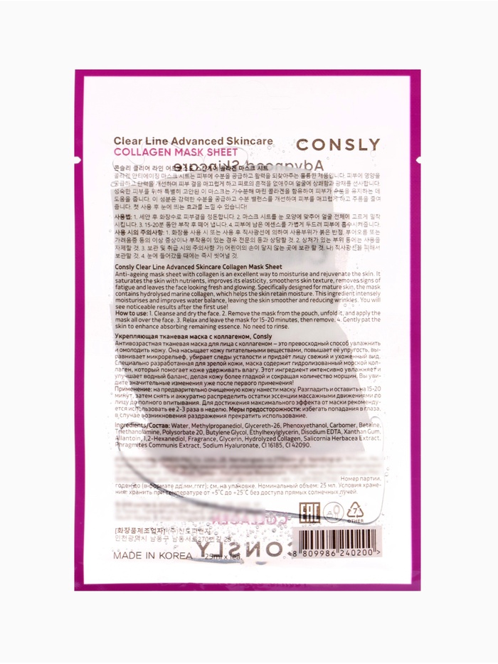 Тканевая маска Consly «С коллагеном» — это средство для антивозрастного ухода, направленное на восстановление упругости, улучшение эластичности и общее омоложение кожи лица. Маска обогащена гидролизованным морским коллагеном, который содержит аминокислоты, способствующие насыщению кожи влагой, повышению её упругости и более гладкой текстуре. За счёт этого кожа выглядит более молодой, упругой и напитанной после применения. Коллаген также помогает уменьшить выраженность мелких морщин и сгладить микрорельеф кожи, придавая лицу ухоженный и свежий вид.