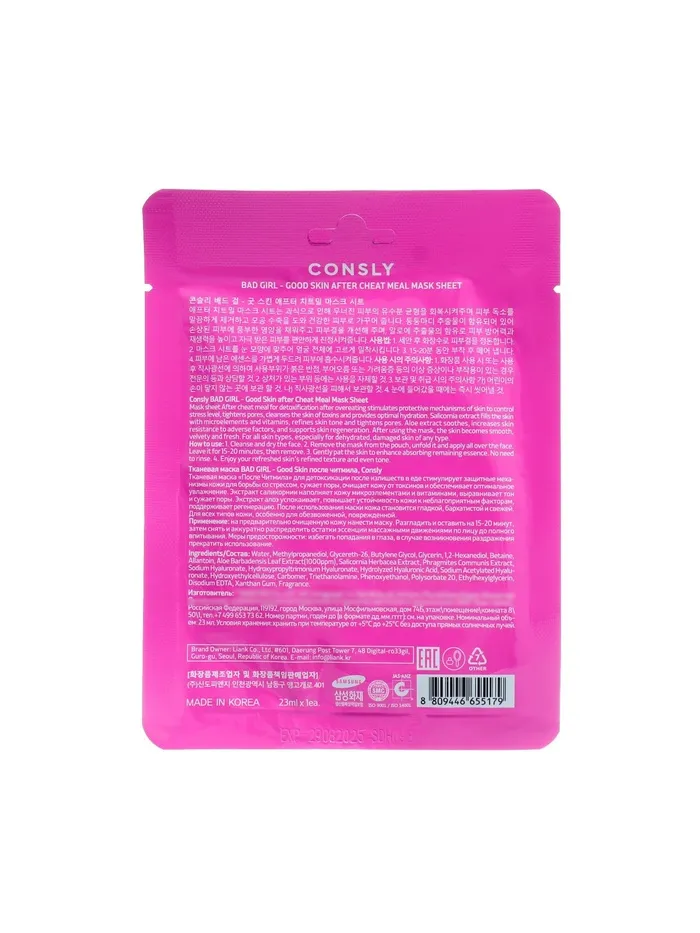 Тканевая маска «После Читмила» для детоксикации после излишеств в еде стимулирует защитные механизмы кожи для борьбы со стрессом, сужает поры, очищает кожу от токсинов и обеспечивает оптимальное увлажнение. Экстракт саликорнии наполняет кожу микроэлементами и витаминами, выравнивает тон и сужает поры. Экстракт алоэ успокаивает, повышает устойчивость кожи к неблагоприятным факторам, поддерживает регенерацию. После использования маски кожа становится гладкой, бархатистой и свежей. Для всех типов кожи, особенно для обезвоженной, поврежденной.