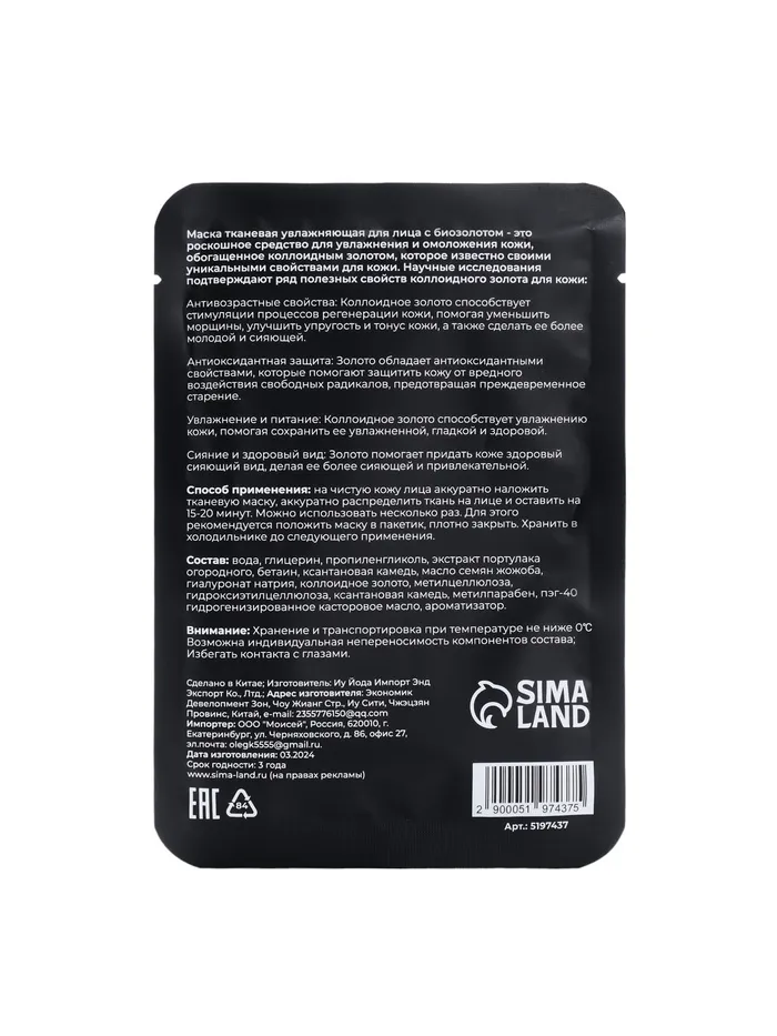 Состав: Water, Colloidal Gold, Cladosiphon okamuranus, Betaine, Serine, Taurine, Sodium Hyaluronate, Triticum Vulgare, Aloe Vera, Hydroxyethylcellulose, Allantoin, Xanthan Gum, Glycerin, Propylene Glycol, Disodium EDTA, PEG-40 Hydrogenated Castor Oil, Methylparaben, Imidazolidinyl Urea, Iodopropynyl Butylcarbamate, Parfum.