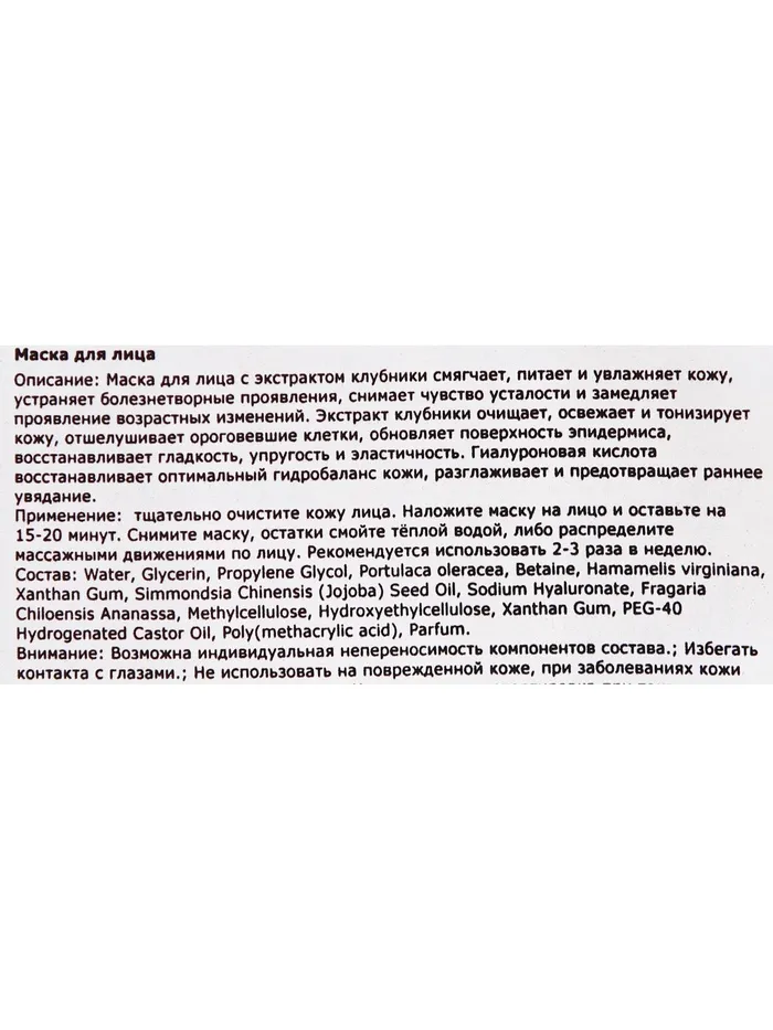 Маска для лица с экстрактом клубники смягчает, питает и увлажняет кожу, устраняет болезнетворные проявления, снимает чувство усталости и замедляет проявление возрастных изменений. Экстракт клубники очищает, освежает и тонизирует кожу, отшелушивает ороговевшие клетки, обновляет поверхность эпидермиса, восстанавливает гладкость, упругость и эластичность. Гиалуроновая кислота восстанавливает оптимальный гидробаланс кожи, разглаживает и предотвращает её раннее увядание.
