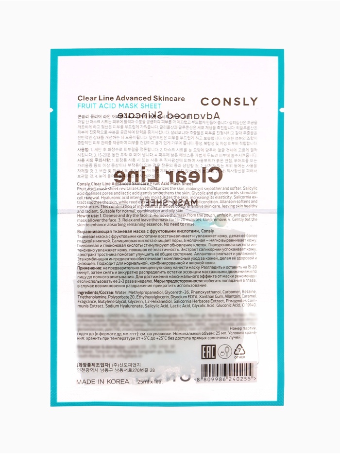 Тканевая маска с фруктовыми кислотами Consly «Восстанавливает и увлажнение», 23 мл — Характеристики