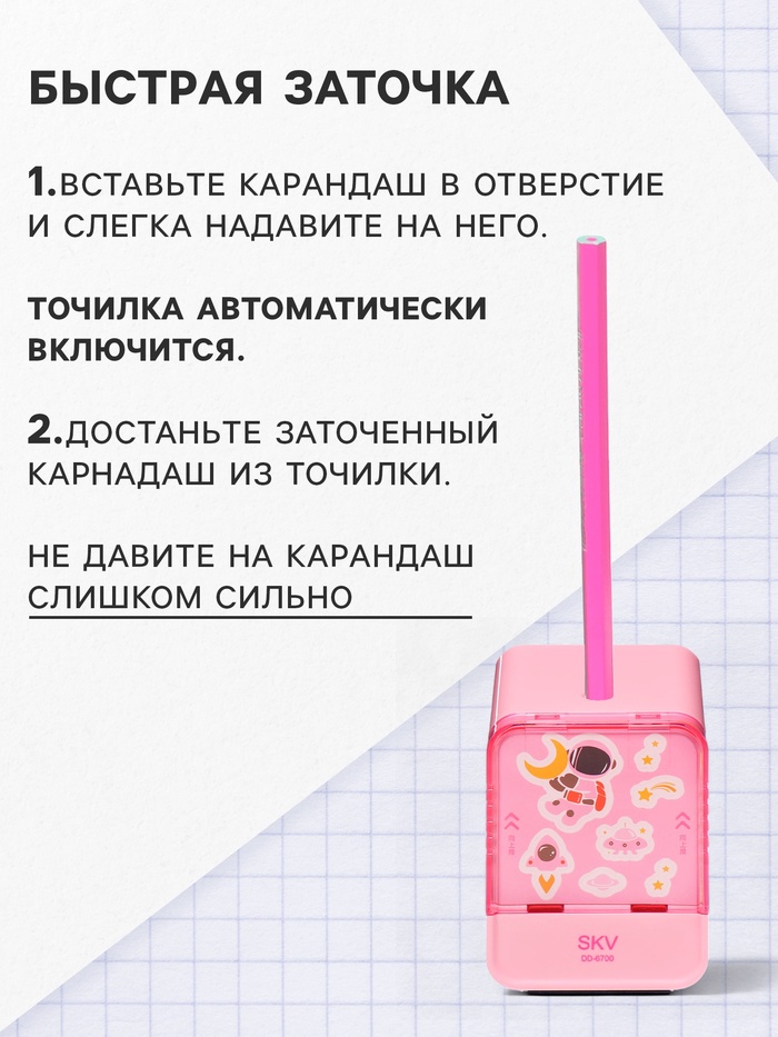 Точилка для карандашей электрическая Calligrata, с контейнером, на батрейках (в комплект не входят), розовая — Характеристики