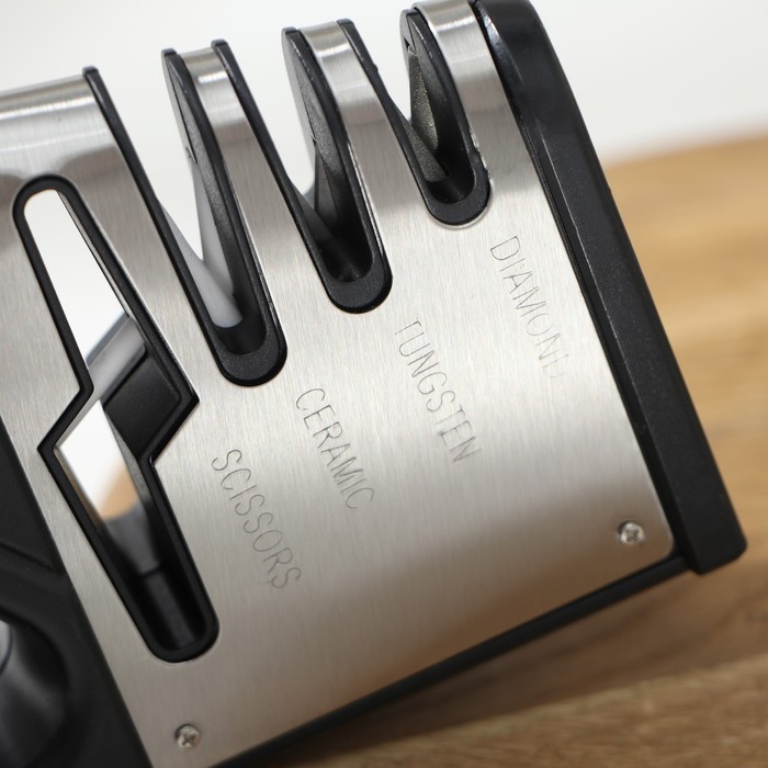 Точилка для ножей выполнена из высококачественных материалов. Она имеет 3 слота для заточки и правки ножей, а также нескользящее основание.