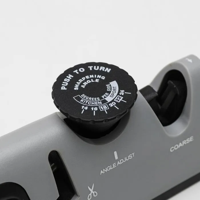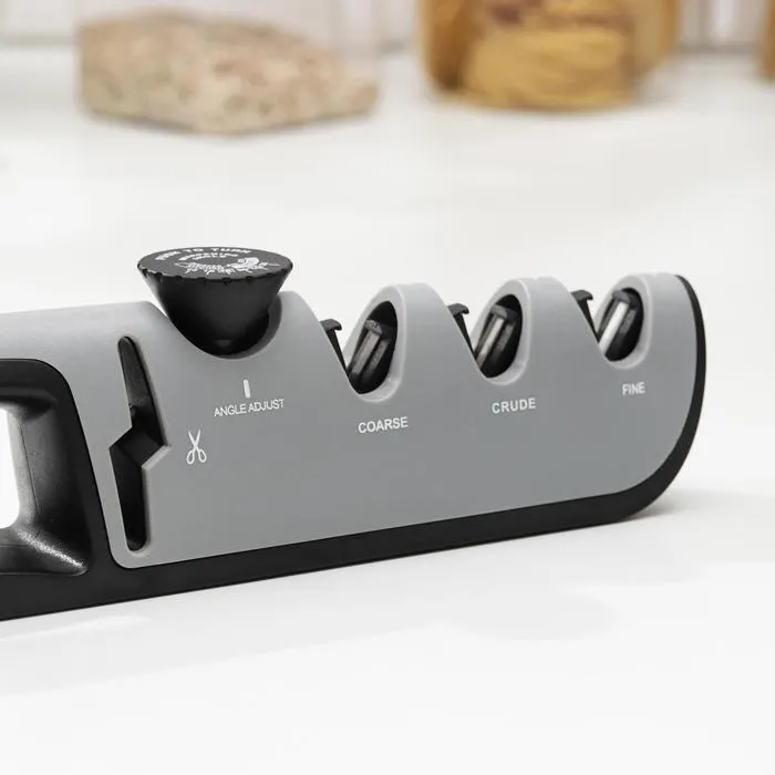 Точилка для ножей выполнена из высококачественных материалов. Она имеет 3 слота для заточки и правки ножей, а также нескользящее основание.