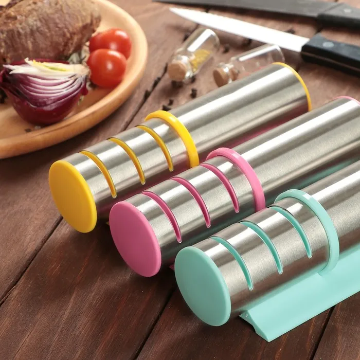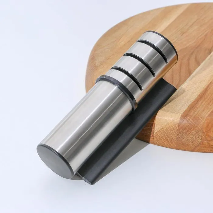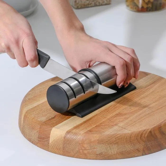 Точилка для ножей выполнена из высококачественных материалов. Она имеет 3 слота для заточки и правки ножей, а также нескользящее основание.