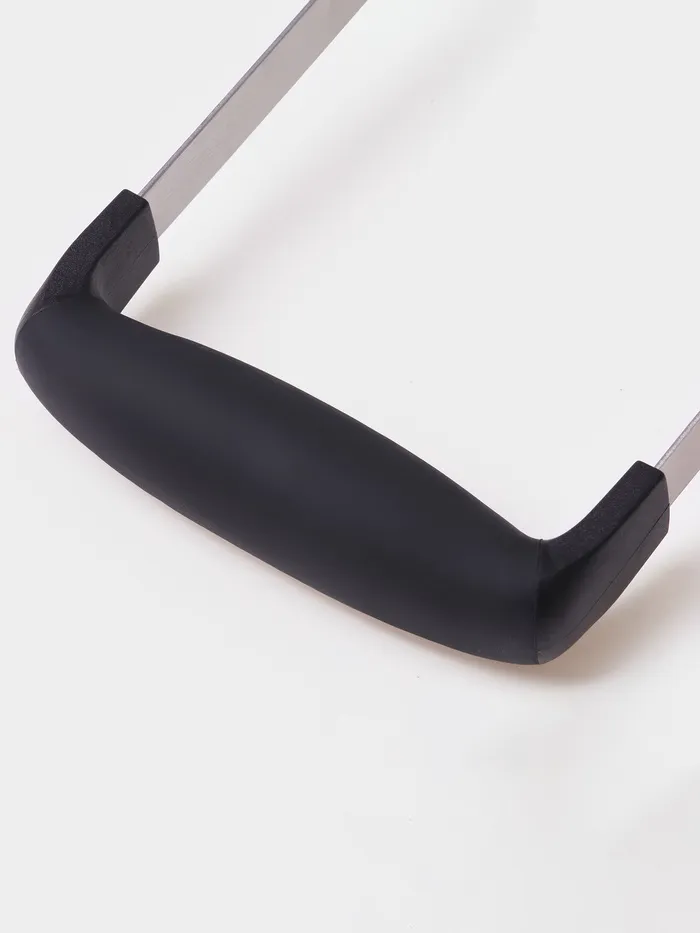 Картофельный пюрешник из нержавеющей стали — это удобный инструмент для быстрого и равномерного разминания варёного картофеля, овощей и других мягких продуктов. Длина 18 см обеспечивает хороший хват, а серебристый цвет и чёрные акценты делают его заметным на кухне. Пластиковая ручка с металлической рабочей частью гарантирует прочность и комфорт при каждом использовании.