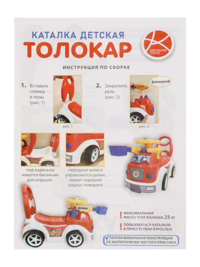 Толокар «Автомобиль» — это пластмассовая игрушка, предназначенная для использования как на улице, так и в доме. Она позволяет малышам прокатиться на собственной пожарке и насладиться спасательными операциями.