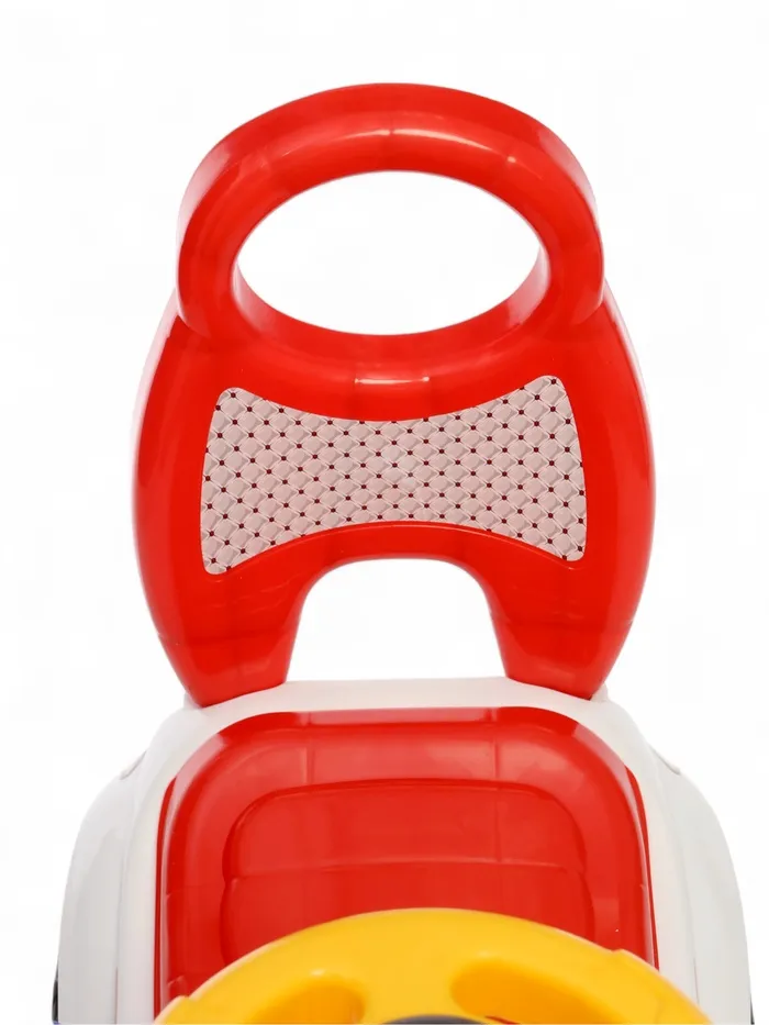 - Машинка приводится в движение с помощью ног ребёнка, который отталкивается ножками от пола, сидя на удобном сиденье.