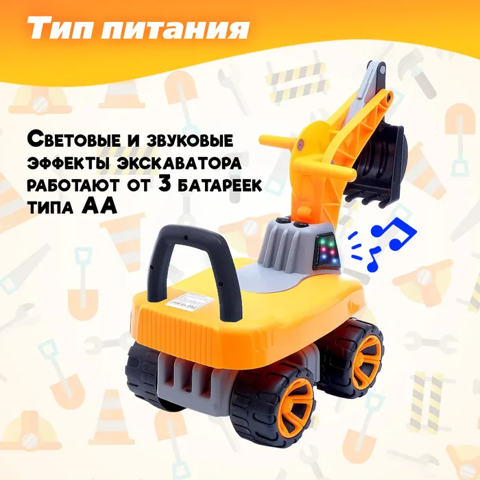 Толокар «Экскаватор», подвижный ковш, световые и звуковые эффекты, цвет оранжевый — Характеристики