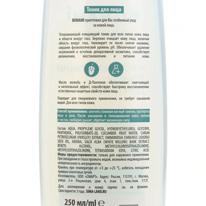 Способ применения: смочить тоником ватный тампон, протереть лицо и шею. После умывания и тонизирования кожа свежая и чистая, свободно дышит, обретает жизненную силу.