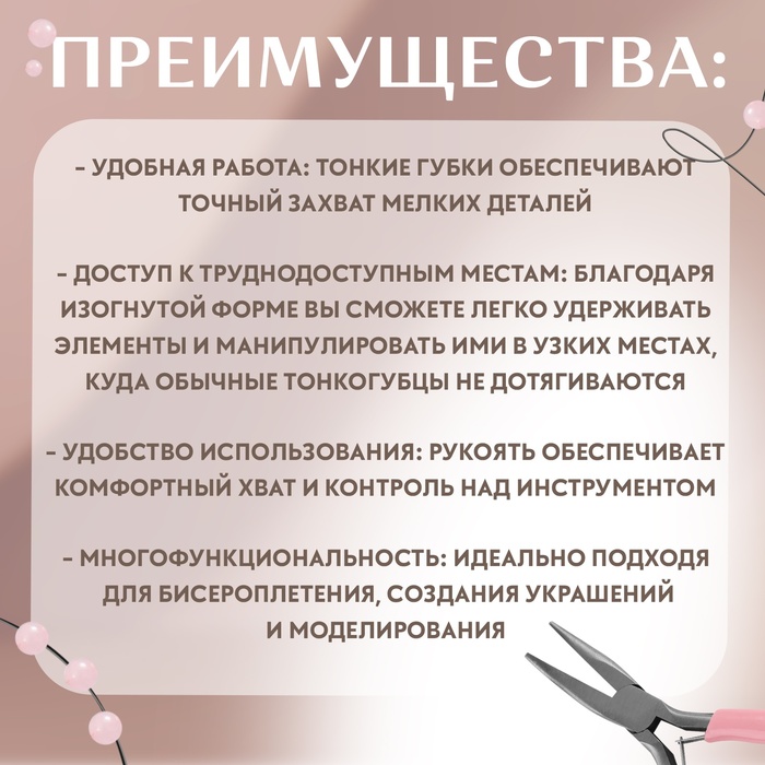 Изогнутые тонкогубцы предназначены для работы с бисером, бусинами и другими мелкими деталями, которые расположены в труднодоступных местах.