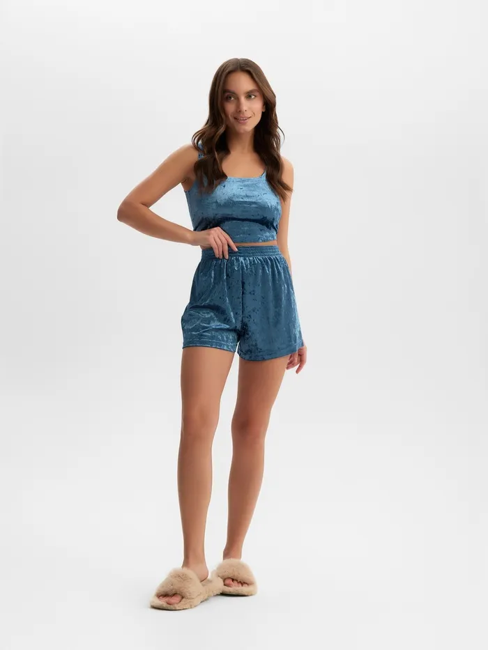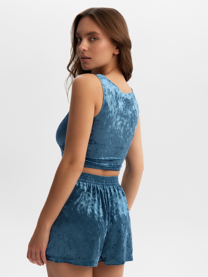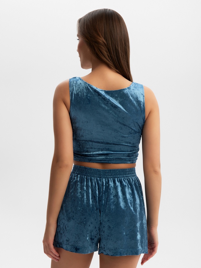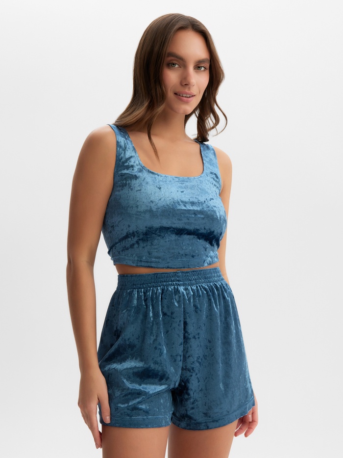 Женский топ KAFTAN Velvet - сочетание комфорта и элегантности. Облегающий крой подчёркивает фигуру, а круглый вырез горловины придаёт образу утончённость. Бархатная фактура делает ткань мягкой и приятной на ощупь. Подходит для повседневной носки и стильных образов. Не деформируется, устойчива к износу и проста в уходе. Синий цвет легко комбинируется с другими элементами гардероба. Комплектуется с шортами. Гипоаллергенный материал обеспечивает комфорт на любой сезон.