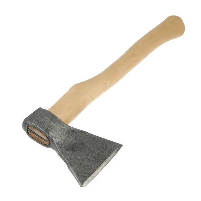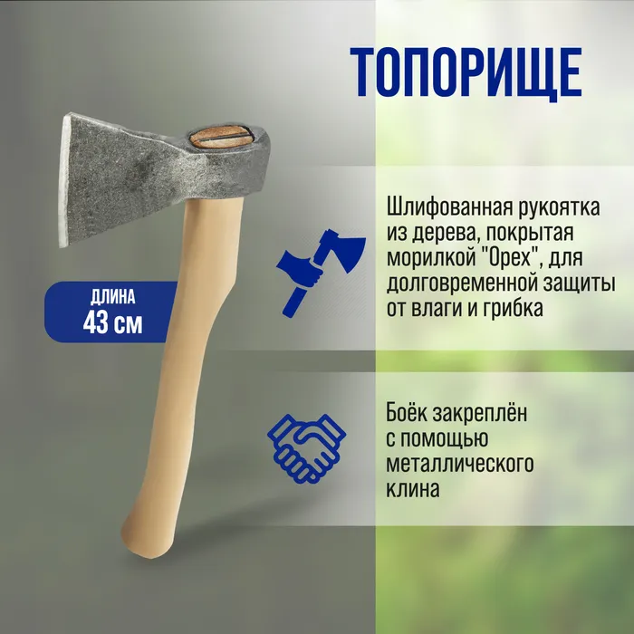 Деревянное топорище выполнено из берёзы. Рукоятка инструмента покрыта морилкой «Орех», которая увеличивает устойчивость дерева к влаге.
