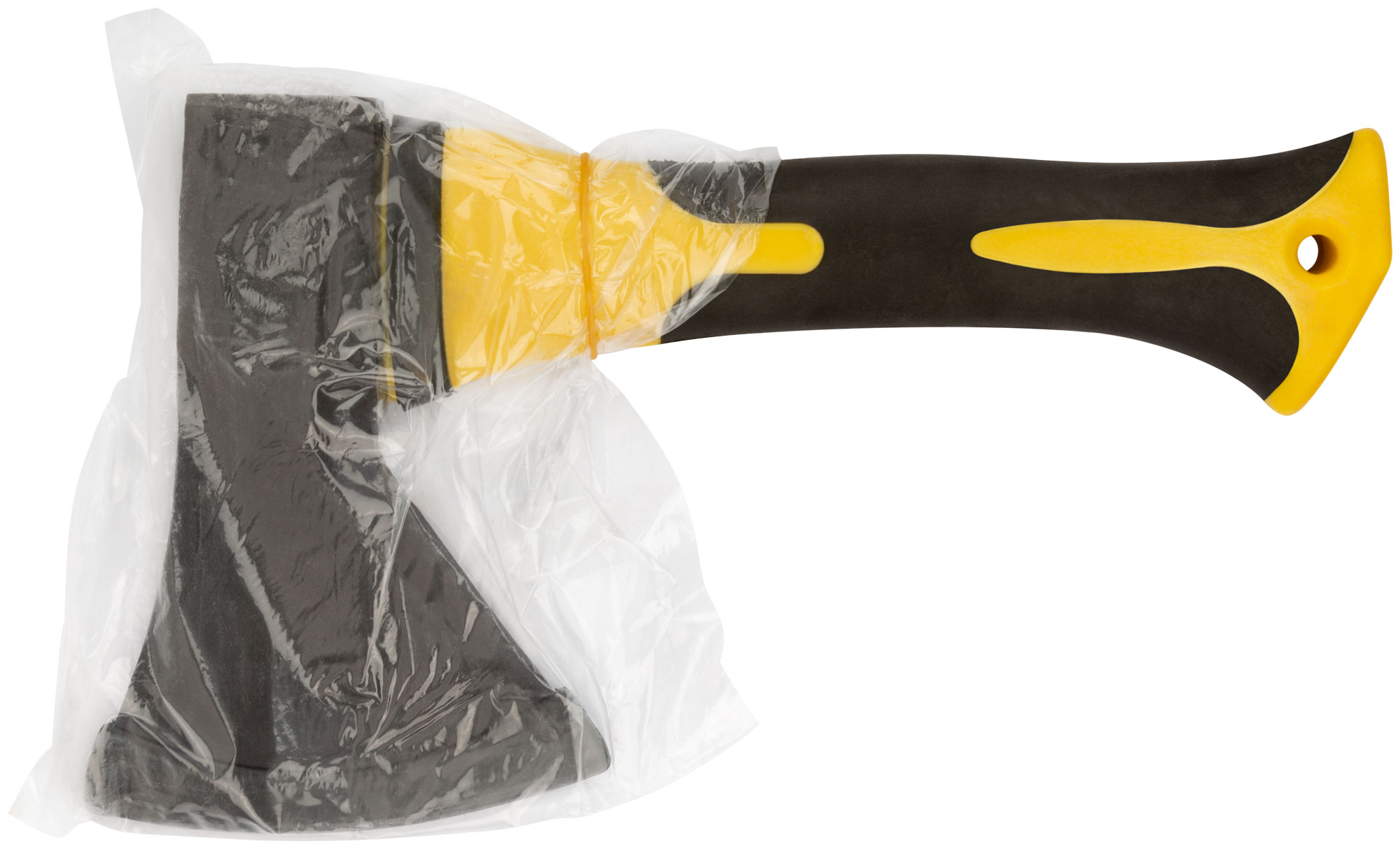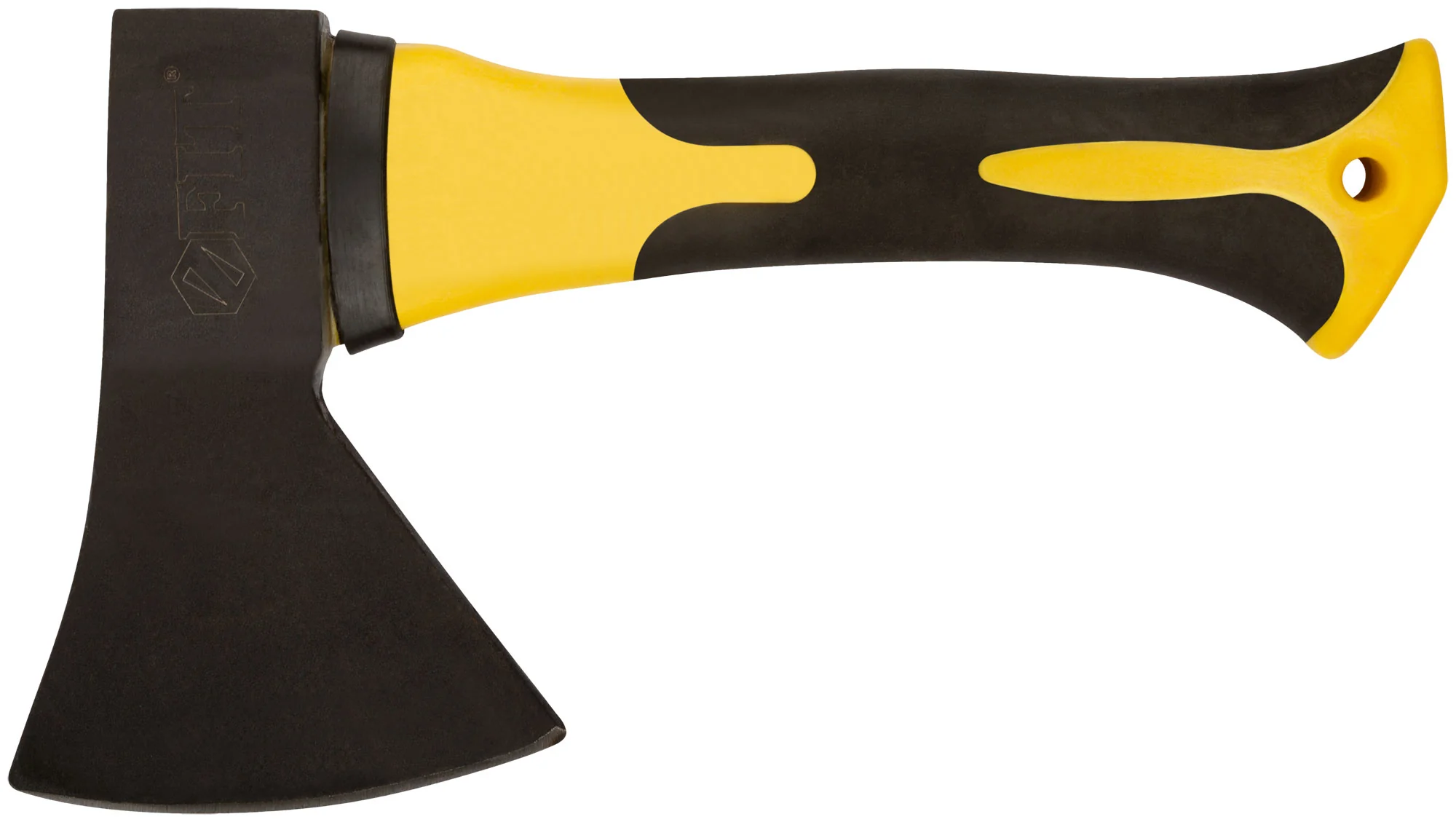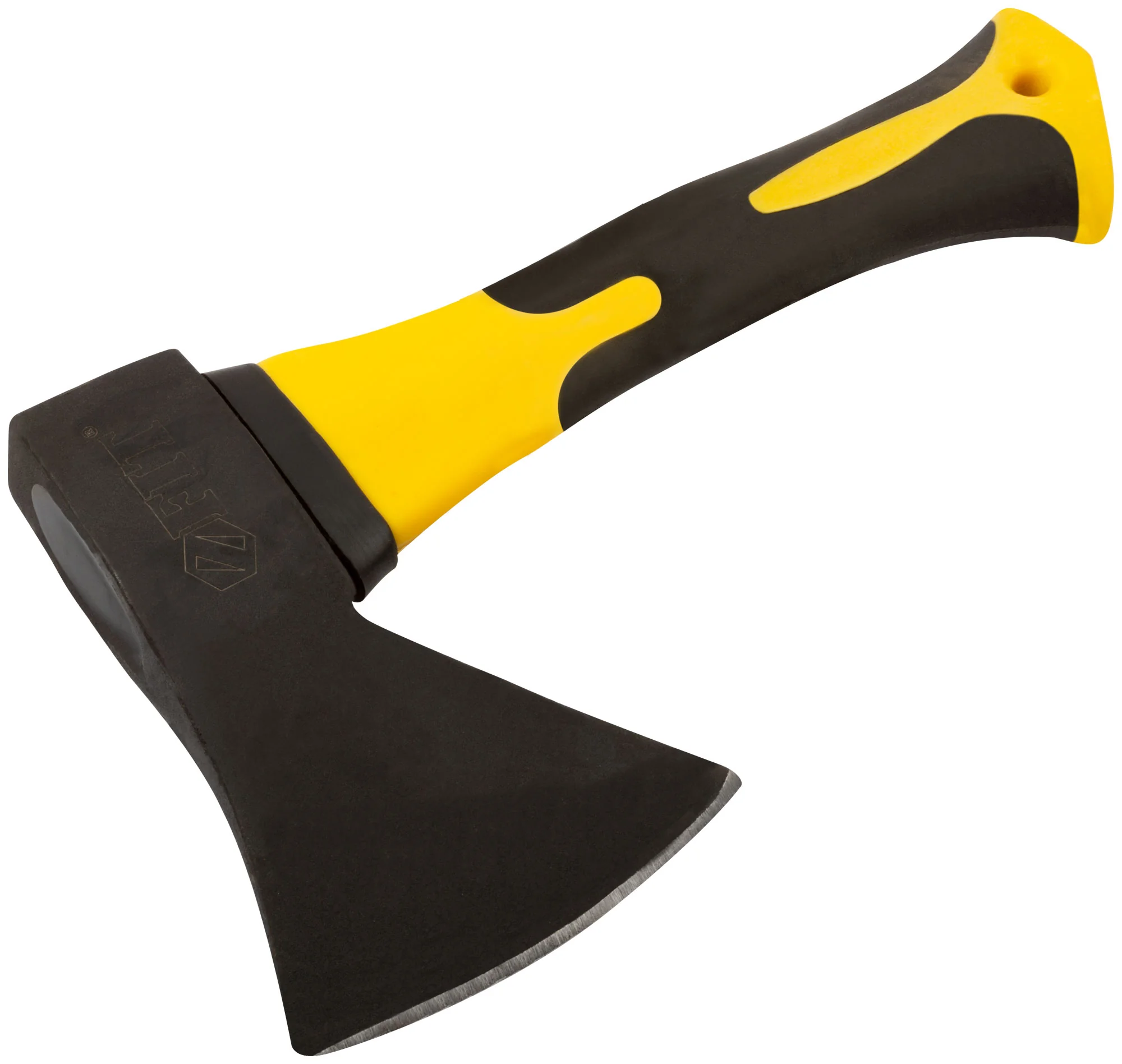Топор изготовлен из кованой инструментальной стали, что обеспечивает его прочность и долговечность. Стальное лезвие покрыто черной порошковой краской, защищающей от коррозии. Укороченная фиберглассовая ручка с прорезиненной поверхностью и добавлением пластика делает топор удобным в использовании и снижает риск скольжения в руке.