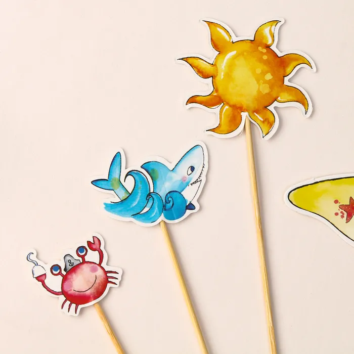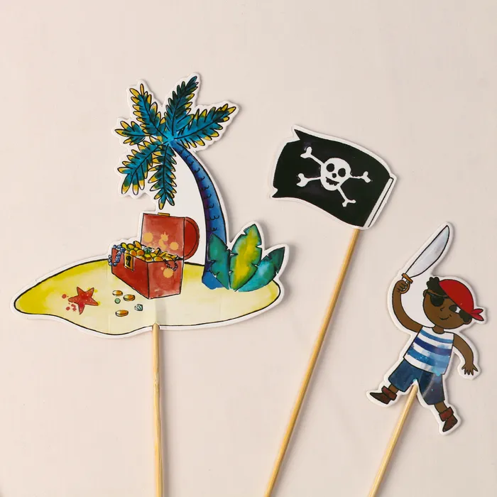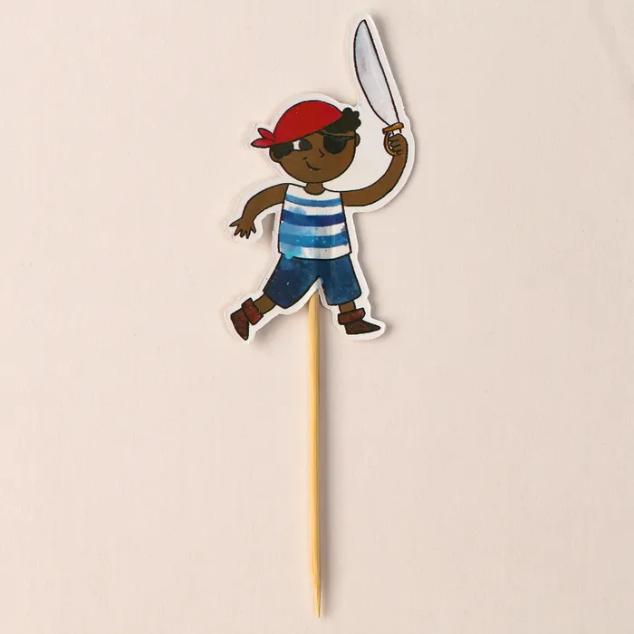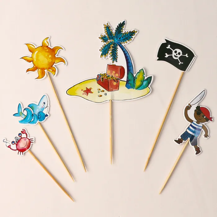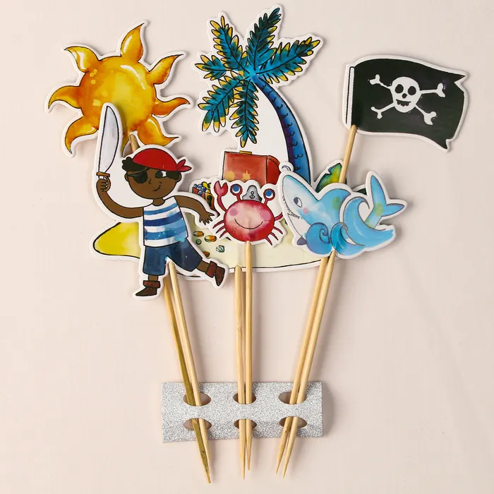 Набор топперов «Пиратская вечеринка» — это великолепный способ оживить праздничный стол и добавить нотки радости в любой десерт. В комплект входят шесть красочных декоративных топперов на пластиковых держателях. Их можно легко установить на торты, капкейки или другие сладости, делая их более праздничными и привлекательными.