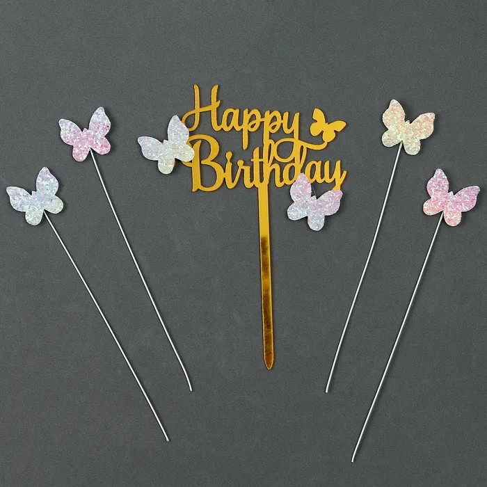 Топпер для торта «С днём рождения. Бабочки», набор 5 шт., золотой — Характеристики