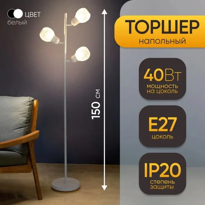 Торшер «3 клюшки» 40 × 60 см, 3 × 10 Вт, алюминий, пластик, свечение тёплое белое — Характеристики