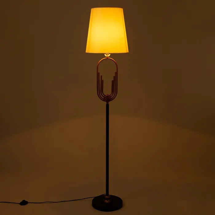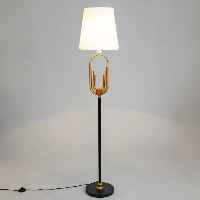 Элегантный торшер станет изысканным дополнением любого современного интерьера. Изящная черная металлическая основа сочетается с мягким текстильным абажуром, создавая гармоничное сочетание материалов.