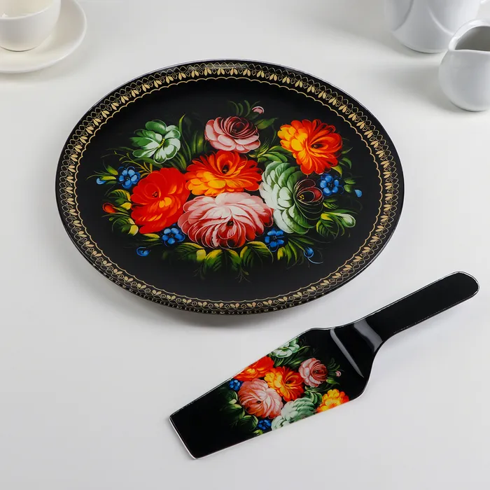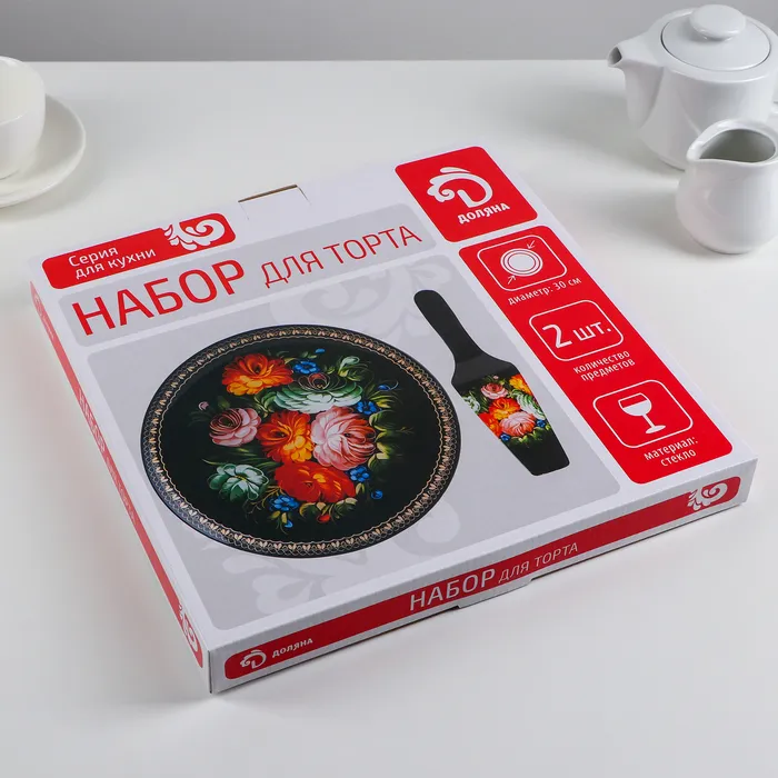 Тортовница Доляна «Народные мотивы», d=30 см, с лопаткой 26.5×7 см, стекло, чёрная — Характеристики