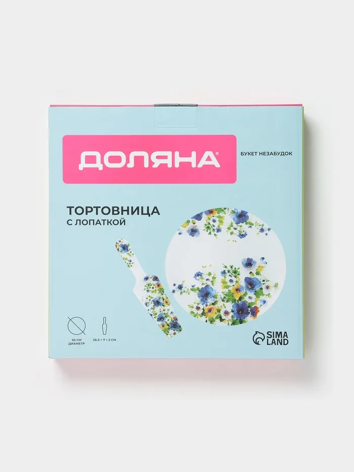 Тортовница с лопаткой Доляна «Букет незабудок», 2 предмета: блюдо d=30 см, лопатка 26.5×7×2 см, стекло, рисунок — Характеристики