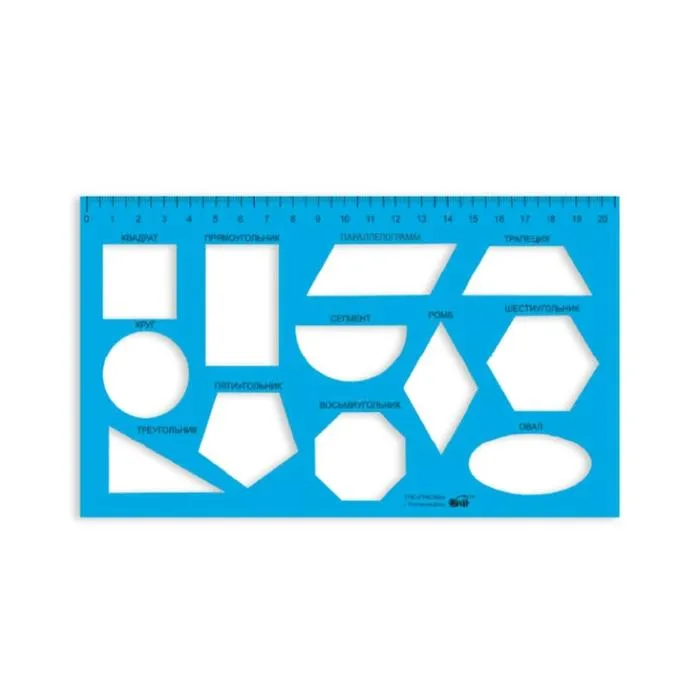 Необходим школьникам, студентам, учителям на уроках геометрии и стереометрии. Для решения задач, выполнения построений и чертежей. Прямоугольная форма корпуса. 12 геометрических элементов. На край нанесена шкала линейки. Трафарет пригодится на занятиях дома, в детском саду, в школе. Материал полистирол.