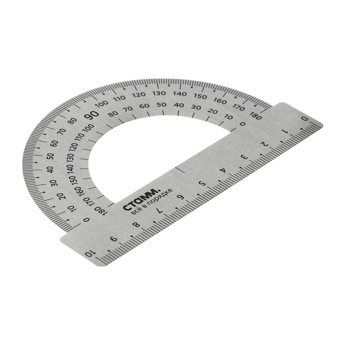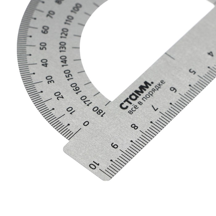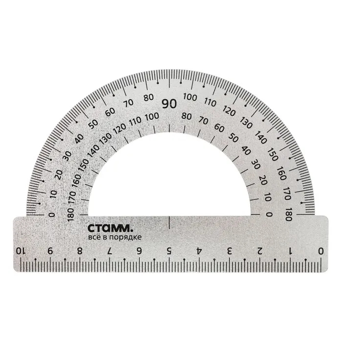 Металлический транспортир СТАММ предназначен для чертёжных и измерительных работ. Материал - высококачественная сталь. Чёткая миллиметровая шкала. Длина шкалы - 10 см, окружность - 180 град. Цвет изделия - серый металлик. Индивидуальная паковка - пакет.